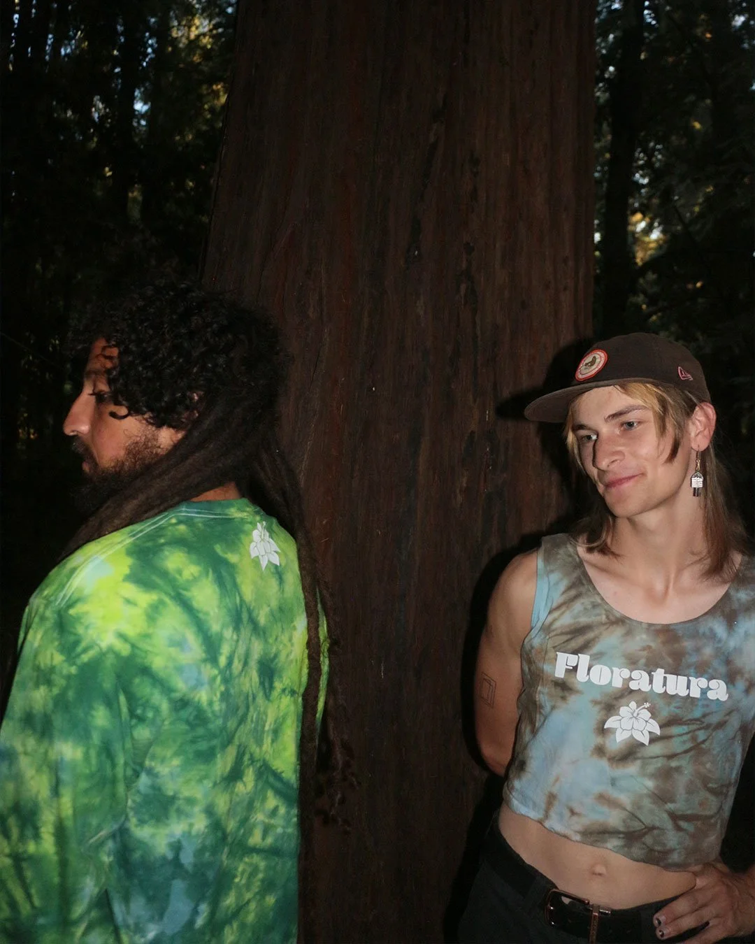 Lovingly hand dyed and printed in Santa Cruz, our T-Shirts, long sleeves and tanks are all available at a Floratura gig near you. Find our merch table, support us and support your wardrobe. 💚💙💜